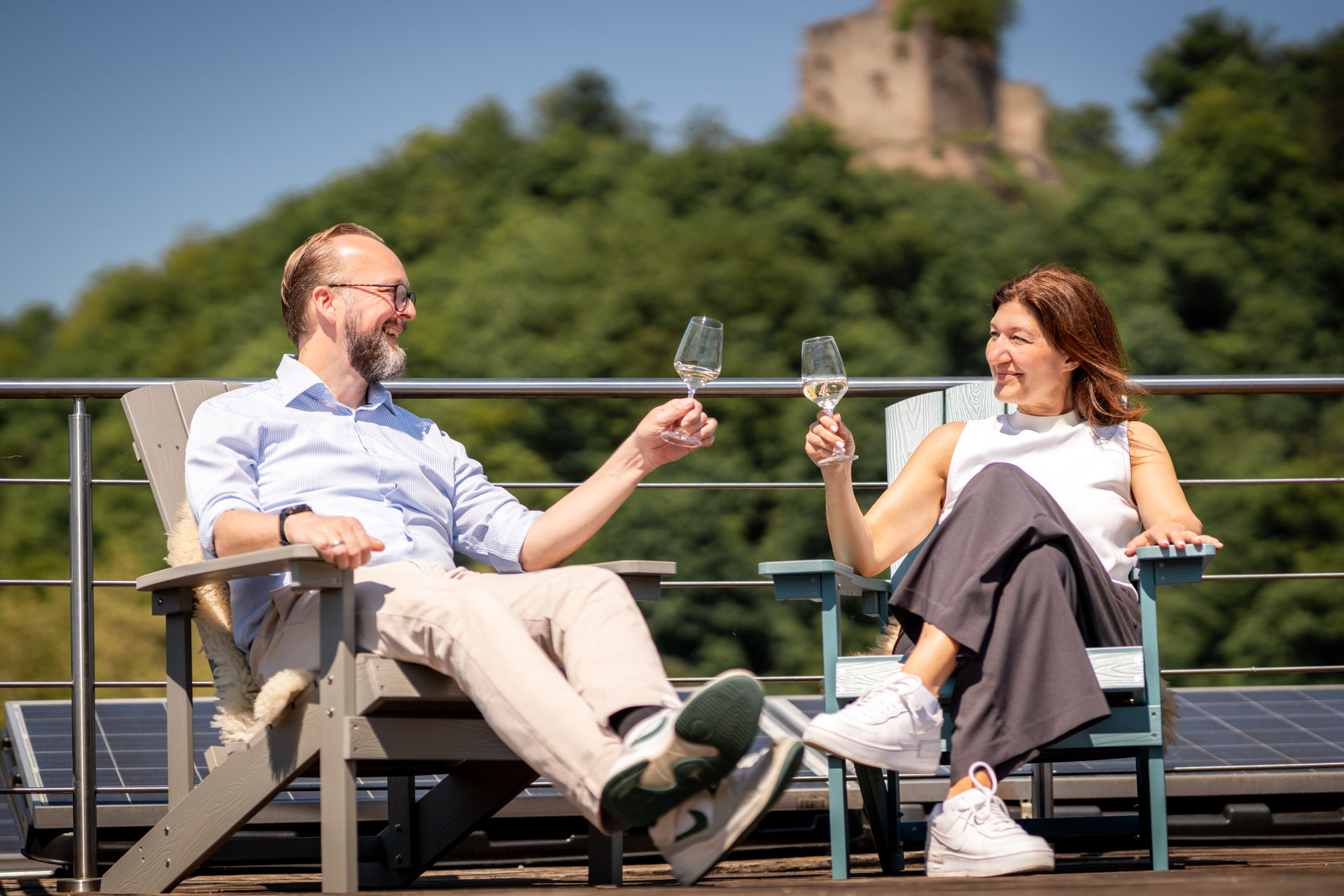 Hoch oben in unserem Storchen erwartet Sie unser Entspannungsnest mit Panorama Sauna und Infrarotkabine. Hier schauen Sie direkt in den Wald zu unserer Kastelburg hinauf und finden, was im Alltag oft fehlt: echte Nestwärme.